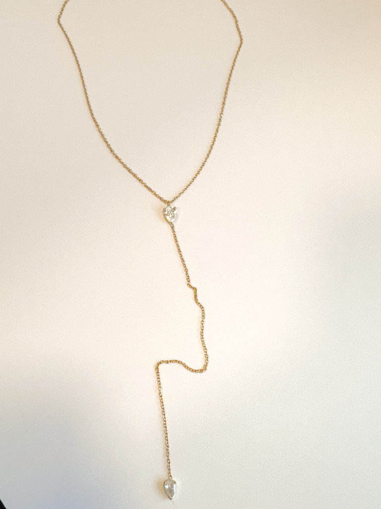 A delicate lariat featuring two brilliant stones that catch the light effortlessly. Minimal, romantic, and perfect for layering.